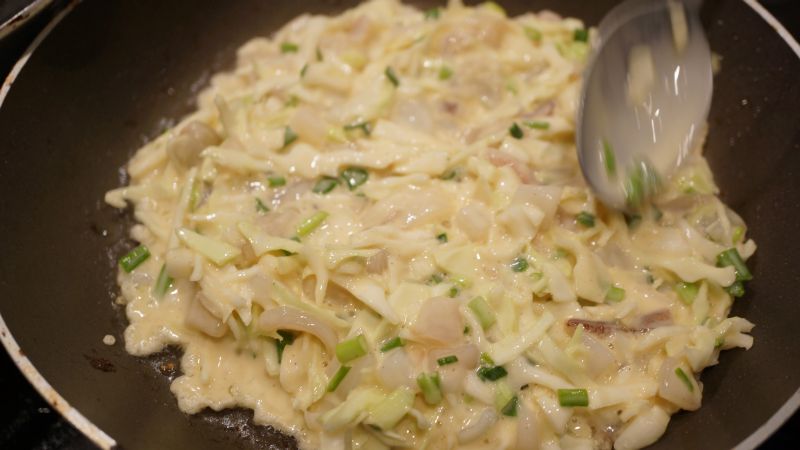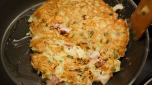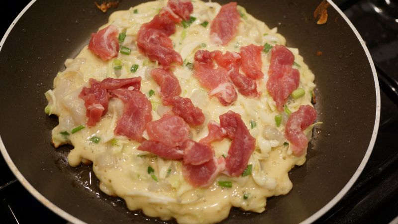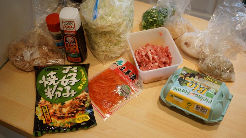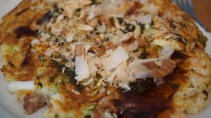 Après un séjour à Osaka, j’ai eu envie d ‘en faire à la maison ! Les célèbres crêpes Nippones ne sont pas si difficile que ça mais elle demande un sérieux coup de main ! J’ai été aidé par une amie Japonaise (je n’ai pris que les photos et j’ai dégusté!) qui m’a montré sa recette. Le secret : le chou Japonais (un peu comme le riz pour les sushi). Ensuite, de la patience pour découper ce dernier, la ciboule, le porc, les coquilles St Jacques, les seiches et les gambas en fin petit dés. Après, la bonne pâte à crêpe à laquelle vous ajouter de l’eau et deux œufs, et selon votre goût, de la seiche ou des crevettes. Une fois le mélange obtenu, vous mettez de l’huile dans votre poêle et vous versez la préparation. Vous saisissez, vous retournez, posez les morceaux de porc. Vous retournez de nouveau et nappez de sauce tonkatsu, de copeaux de bonite, de gingembre et d’aonori (algue verte).