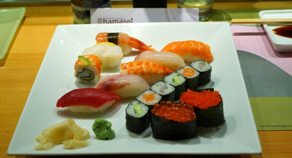A deux pas de la fontaine de Trevi, Hamasei est le plus vieux restaurant Nippon de la capitale éternelle En effet, depuis 1974, des sushi sont servis dans ce restaurant. Le lieu est élégant et le personnel serviable. J’avais réservé au comptoir et c’est la première fois que j’ai vu une chef dans un tel restaurant. Par contre, je n’ai pas apprécié le chef, jeune et un peu arrogant, qui a retiré les plats du comptoir devant moi car je les prenais en photo… Bon point pour les coupelles à sauce soja en forme de poisson et toutes différentes. Les poissons sont frais et j’ai peu gouté un sushi en forme de boule au homard : décevant. J’ai aussi gouté un plat tout simple et bon : le Nama Tamago, juste du riz et un jaune d’œuf. Excellent point pour l’eau gazeuse Espagnole, Magma, extraordinaire ! Et cela reste quand même 30% moins cher qu’à Paris ou à Londres.