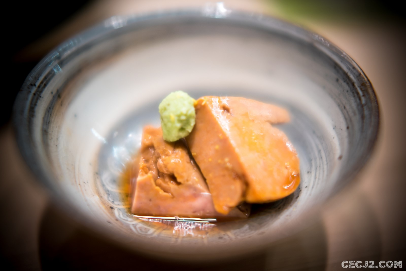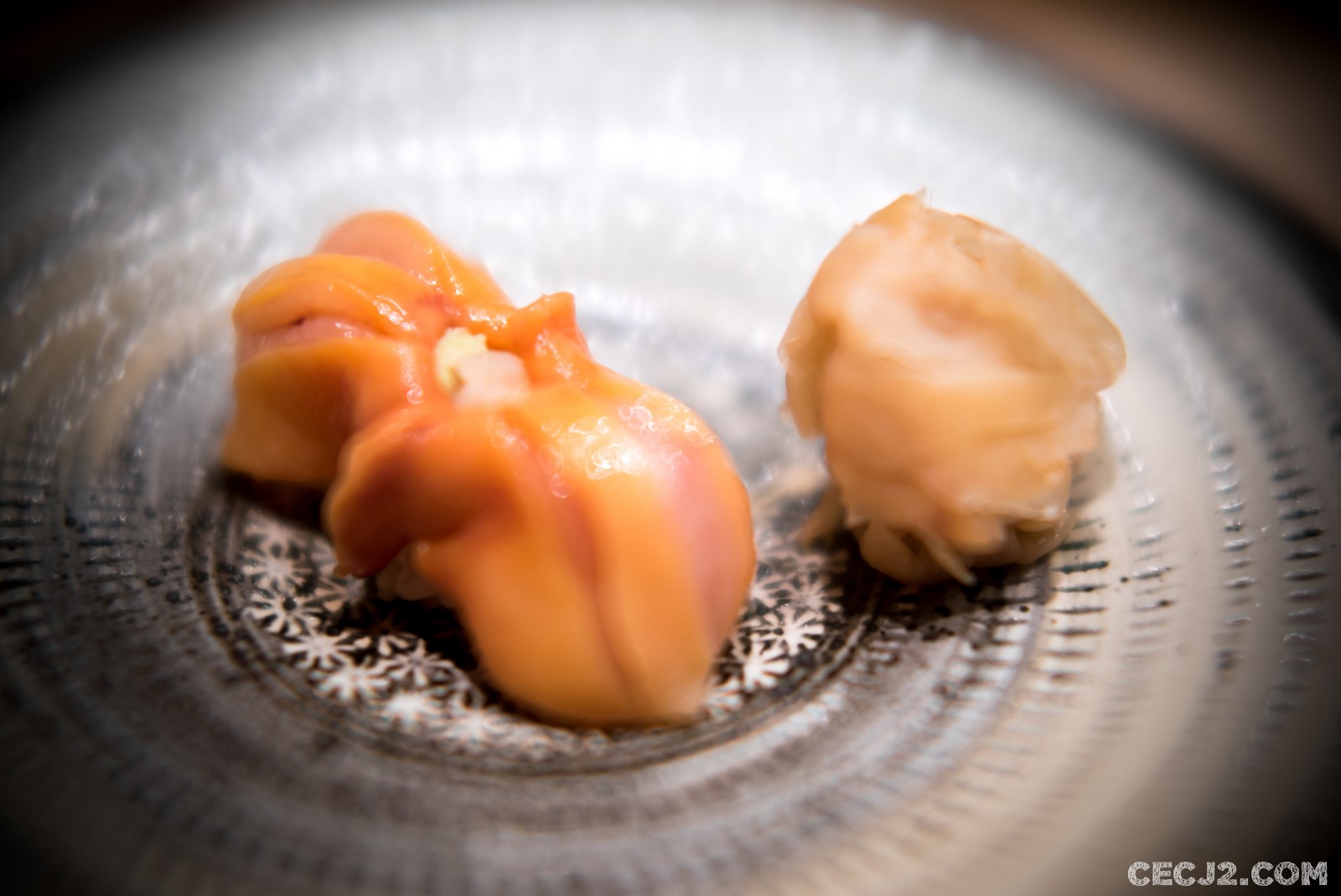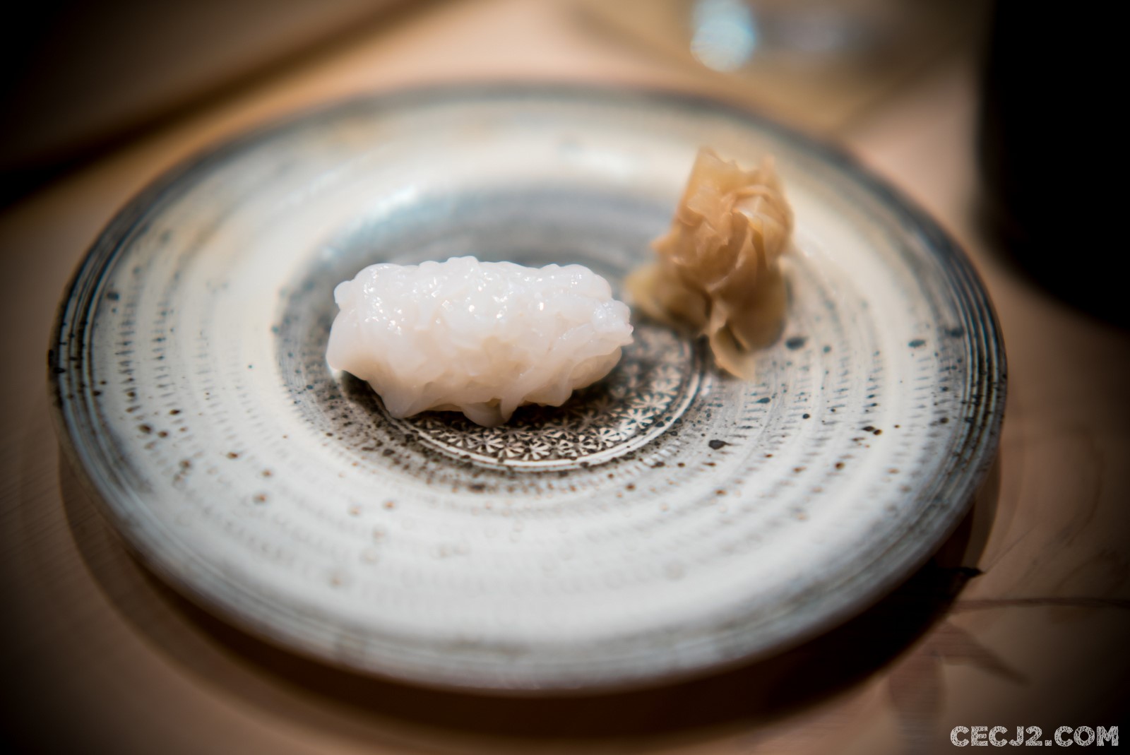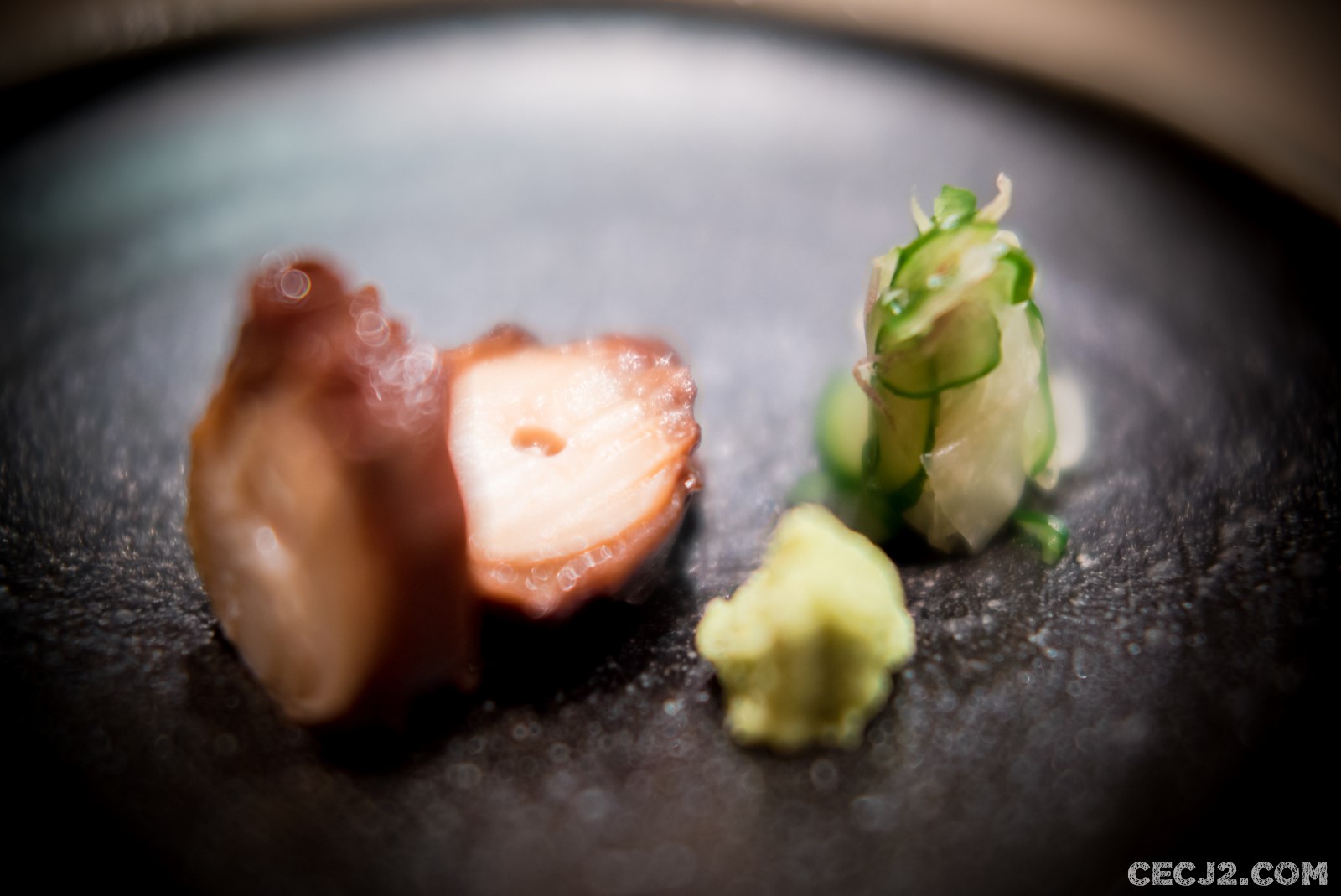 Sushi Shikon est mon premier « 3 étoiles » au Guide Michelin dans la catégorie sushi. Pourtant, il ne s’agit que d’un comptoir, d’un chef et de son équipe, qui sert du poisson cru. Qu’est-ce qui justifie une telle distinction ? C’est très simple : la fraîcheur des produits et leur origine. Nous avons beau être en Chine, tout, et je dis bien tout vient du Japon. Les poissons bien sur mais aussi le charbon Binchotan 備長炭 mais aussi plus étonnant, l’eau. On comprend vite ici que chaque détails comptent. Ensuite, le chef est issu d’une famille de Tokyo où il est le troisième maître sushi. Il nous a raconté qu’à 3 ans son père lui préparait déjà des morceaux de poisson cru. Et nous avons eu l’immense honneur que Yoshiharu Kakinuma nous prépare le repas ce soir là. Ce que j’ai vraiment apprécié, en plus de l’expérience hors de temps que représente un repas de sushi pour moi, c’est sa gentillesse et sa simplicité. Il a bien pris le temps de répondre à mes questions et nous a expliqué en détails notre repas. Ses gestes sont précis : il plonge la main droite dans la glace pour ne pas réchauffer le poisson et sa découpe est fluide. Sa connaissance du poisson est immense car il se permet de faisander des thons ou des maquereaux ibériques pour en révéler toutes les subtilités. En entrée, un crabe des glaces Kobako femelle avec ses œufs. Le goût fin est relevé par des saveurs marines discrètes. Nous avons eu le droit à un plat hors carte, du foie d’ormeau, du « foie gras » dans le texte (le chef aime bien la cuisine du Passage 53 à Paris). Un des plats phares du chef, c’est la pieuvre mariné : étonnante saveur, presque tendre, avec des accents de porc ibérique. Très bien maîtrisé. Pendant ce temps, sur le fameux charbon, nous avons eu un poisson légèrement grillé aux accents boisés et fondant. Là encore, tout est dans le geste, avec l’assistant qui râpe au dernier moment un zeste de Yuzu. Un plat qui m’a un peu déçu fut le Chawan-mushi que j’ai trouvé trop acide. Puis viennent les sushi, tous plus beaux et délicieux les uns que les autres : thon gras, oursin, anguille de mer, une omelette sucrée… Le riz est parfois blanc, parfois imprégné de vinaigre brun. Je retiendrai le calamar Ika finement ciselé aux saveurs de beurre, les deux types d’oursins Uni d’Hokkaïdo, l’un sucré, l’autre iodé, le thon rouge rutilant et fondant, et les immenses crevettes tigre. Enfin, en dessert, et comble du snobisme, des fraises Japonaises en plein mois de décembre. Sushi Shikon est effectivement un endroit unique où je ne regrette pas d’être allé même s’il a fallu batailler ferme pour prendre des photos, car normalement, on ne peut les prendre qu’avec un téléphone. Je doute que le lecteur assidu est apprécié ce genre de photos sur un restaurant de cette classe. Enfin, le prix est exorbitant et je vous conseille d’y aller à midi si vous êtes tentés car c’est presque deux fois moins cher. La décoration est simple avec un long comptoir en bois et un autel au Dieu des pêcheurs Yebisu au fond. Une expérience unique que je n’oublierai jamais.