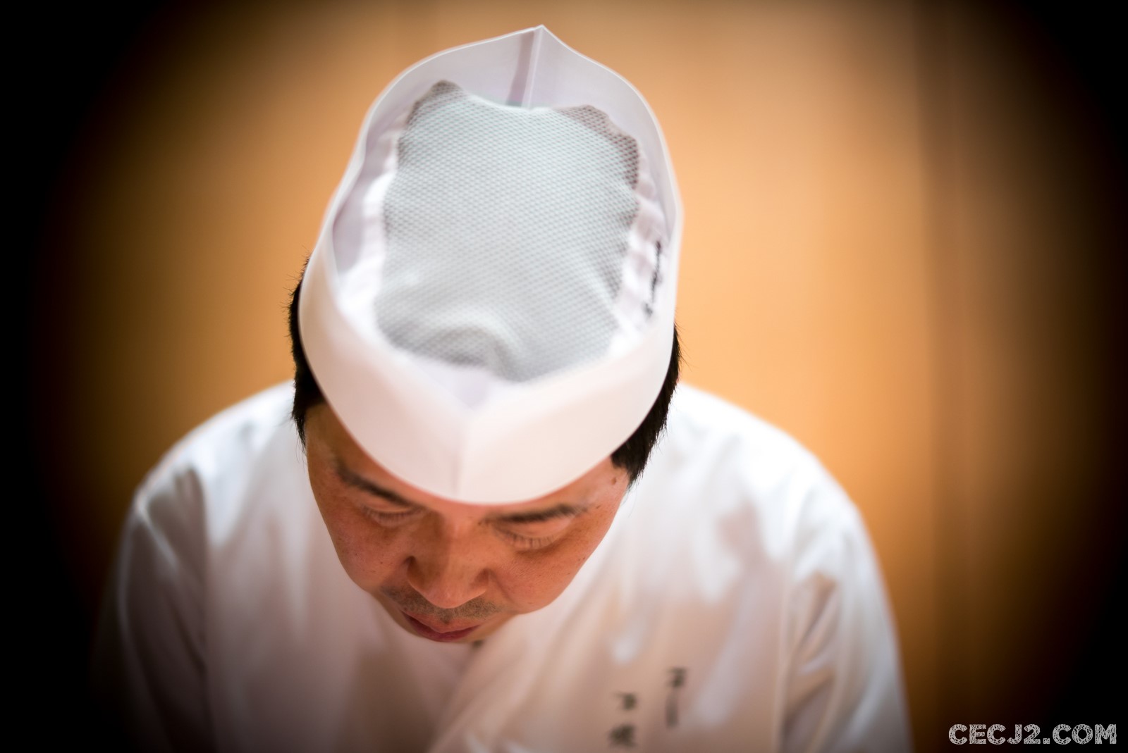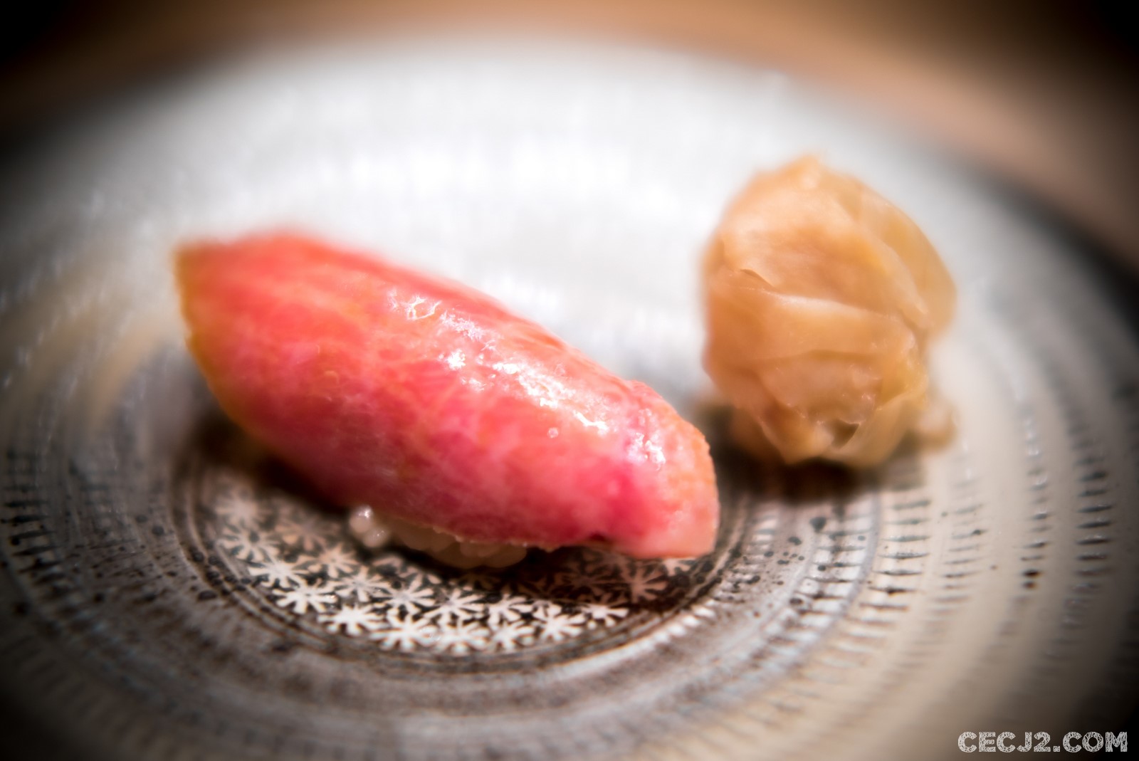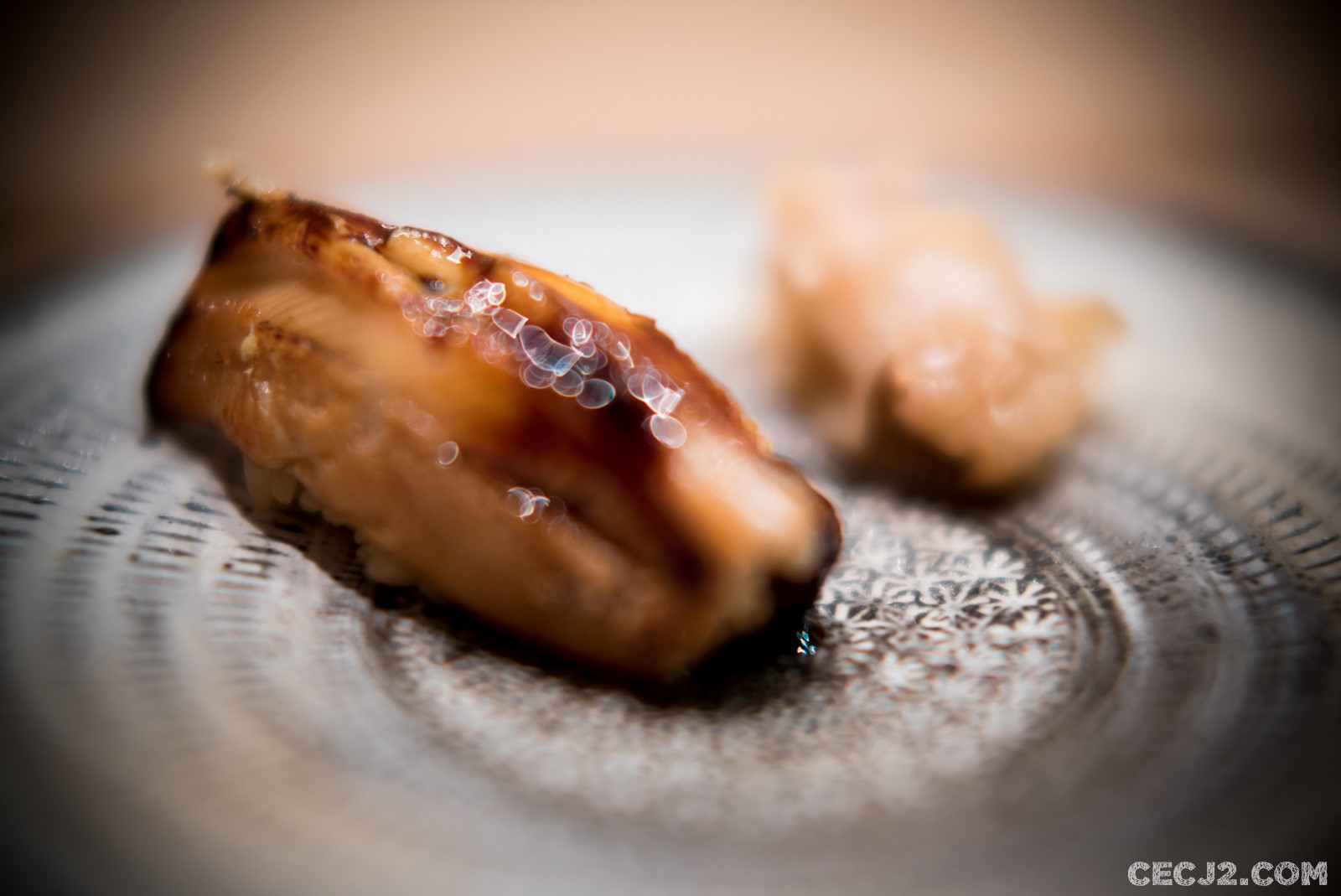 Sushi Shikon est mon premier « 3 étoiles » au Guide Michelin dans la catégorie sushi. Pourtant, il ne s’agit que d’un comptoir, d’un chef et de son équipe, qui sert du poisson cru. Qu’est-ce qui justifie une telle distinction ? C’est très simple : la fraîcheur des produits et leur origine. Nous avons beau être en Chine, tout, et je dis bien tout vient du Japon. Les poissons bien sur mais aussi le charbon Binchotan 備長炭 mais aussi plus étonnant, l’eau. On comprend vite ici que chaque détails comptent. Ensuite, le chef est issu d’une famille de Tokyo où il est le troisième maître sushi. Il nous a raconté qu’à 3 ans son père lui préparait déjà des morceaux de poisson cru. Et nous avons eu l’immense honneur que Yoshiharu Kakinuma nous prépare le repas ce soir là. Ce que j’ai vraiment apprécié, en plus de l’expérience hors de temps que représente un repas de sushi pour moi, c’est sa gentillesse et sa simplicité. Il a bien pris le temps de répondre à mes questions et nous a expliqué en détails notre repas. Ses gestes sont précis : il plonge la main droite dans la glace pour ne pas réchauffer le poisson et sa découpe est fluide. Sa connaissance du poisson est immense car il se permet de faisander des thons ou des maquereaux ibériques pour en révéler toutes les subtilités. En entrée, un crabe des glaces Kobako femelle avec ses œufs. Le goût fin est relevé par des saveurs marines discrètes. Nous avons eu le droit à un plat hors carte, du foie d’ormeau, du « foie gras » dans le texte (le chef aime bien la cuisine du Passage 53 à Paris). Un des plats phares du chef, c’est la pieuvre mariné : étonnante saveur, presque tendre, avec des accents de porc ibérique. Très bien maîtrisé. Pendant ce temps, sur le fameux charbon, nous avons eu un poisson légèrement grillé aux accents boisés et fondant. Là encore, tout est dans le geste, avec l’assistant qui râpe au dernier moment un zeste de Yuzu. Un plat qui m’a un peu déçu fut le Chawan-mushi que j’ai trouvé trop acide. Puis viennent les sushi, tous plus beaux et délicieux les uns que les autres : thon gras, oursin, anguille de mer, une omelette sucrée… Le riz est parfois blanc, parfois imprégné de vinaigre brun. Je retiendrai le calamar Ika finement ciselé aux saveurs de beurre, les deux types d’oursins Uni d’Hokkaïdo, l’un sucré, l’autre iodé, le thon rouge rutilant et fondant, et les immenses crevettes tigre. Enfin, en dessert, et comble du snobisme, des fraises Japonaises en plein mois de décembre. Sushi Shikon est effectivement un endroit unique où je ne regrette pas d’être allé même s’il a fallu batailler ferme pour prendre des photos, car normalement, on ne peut les prendre qu’avec un téléphone. Je doute que le lecteur assidu est apprécié ce genre de photos sur un restaurant de cette classe. Enfin, le prix est exorbitant et je vous conseille d’y aller à midi si vous êtes tentés car c’est presque deux fois moins cher. La décoration est simple avec un long comptoir en bois et un autel au Dieu des pêcheurs Yebisu au fond. Une expérience unique que je n’oublierai jamais.