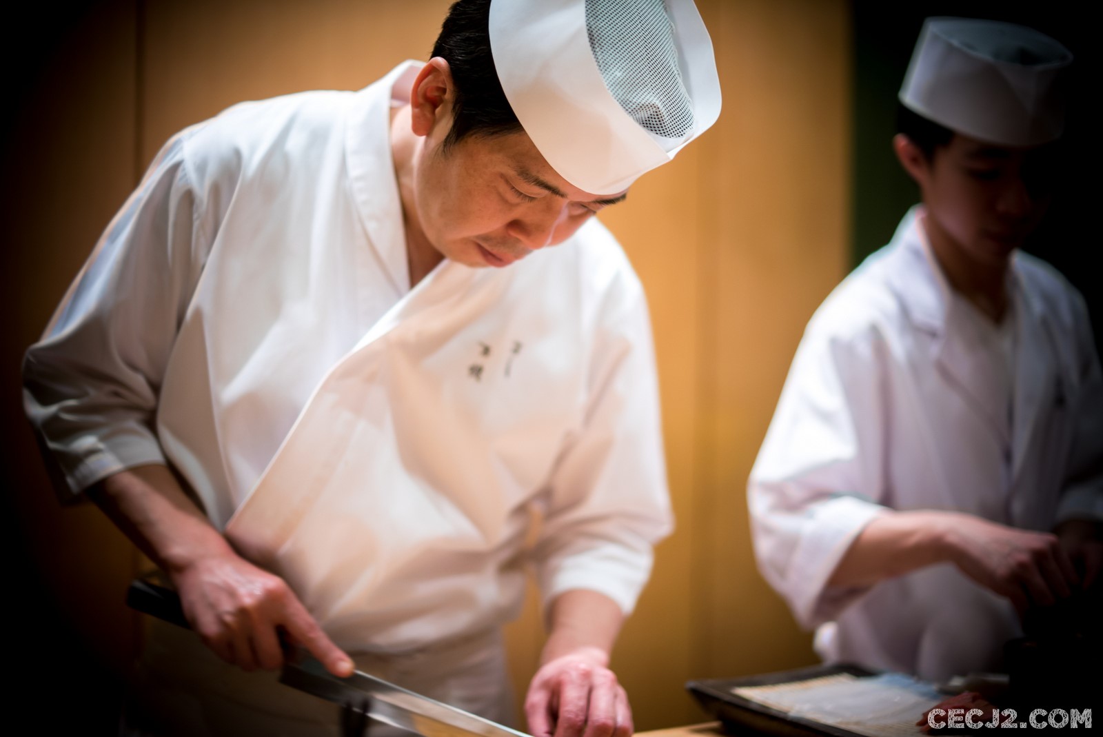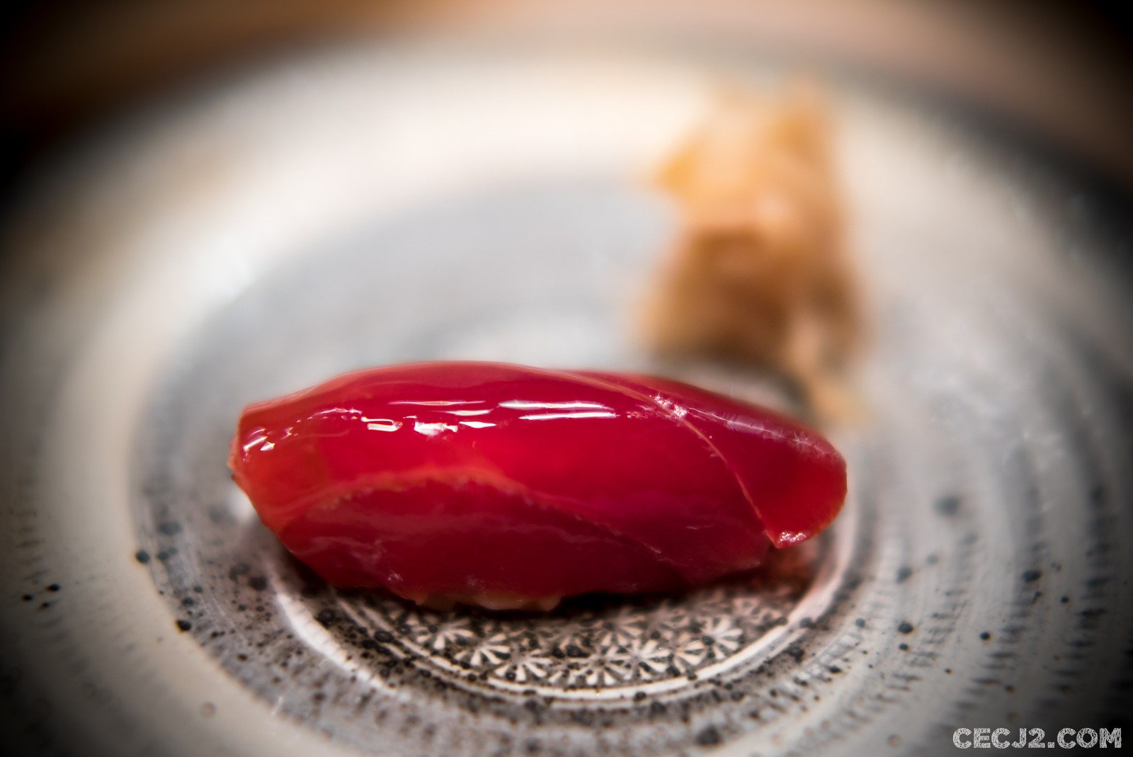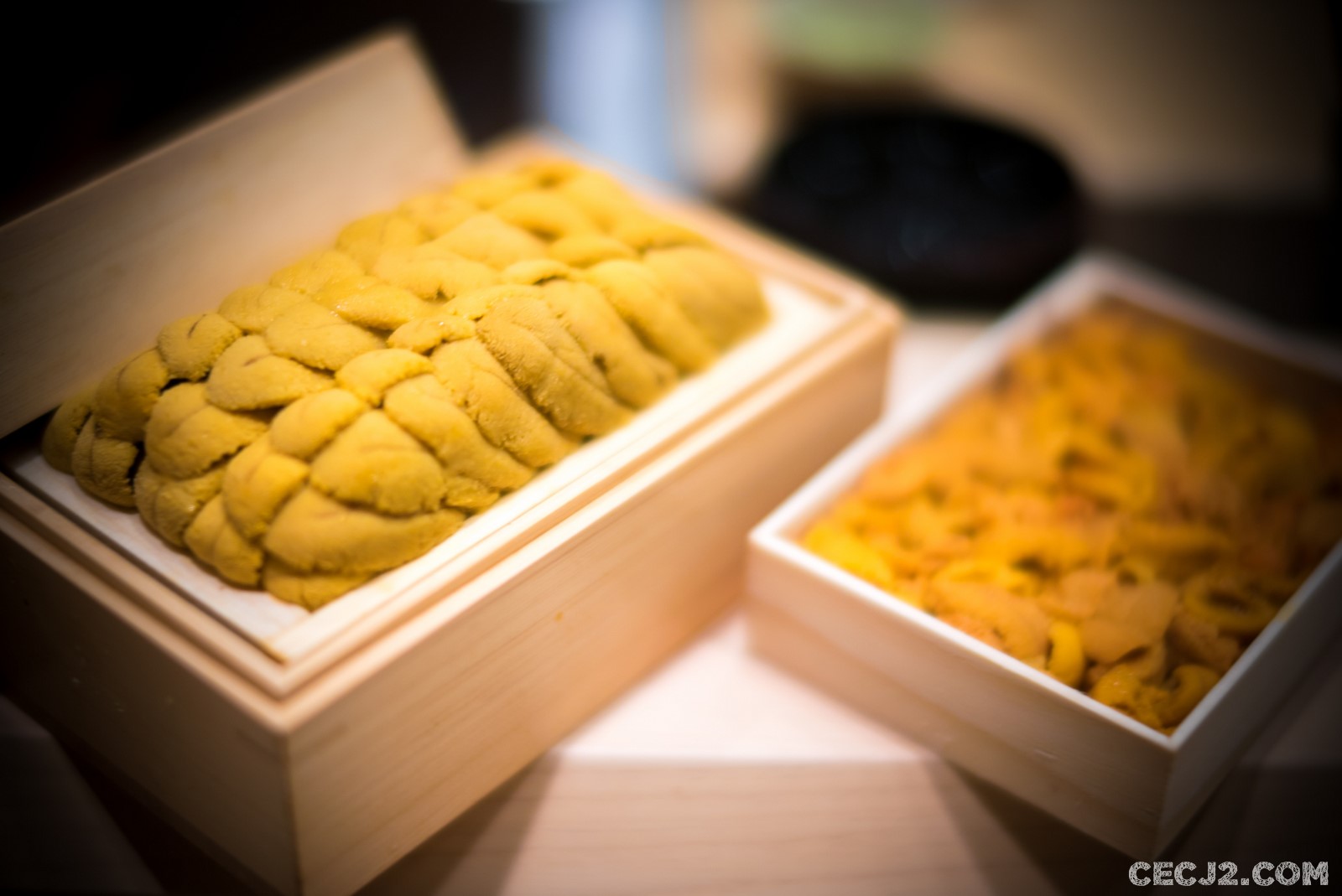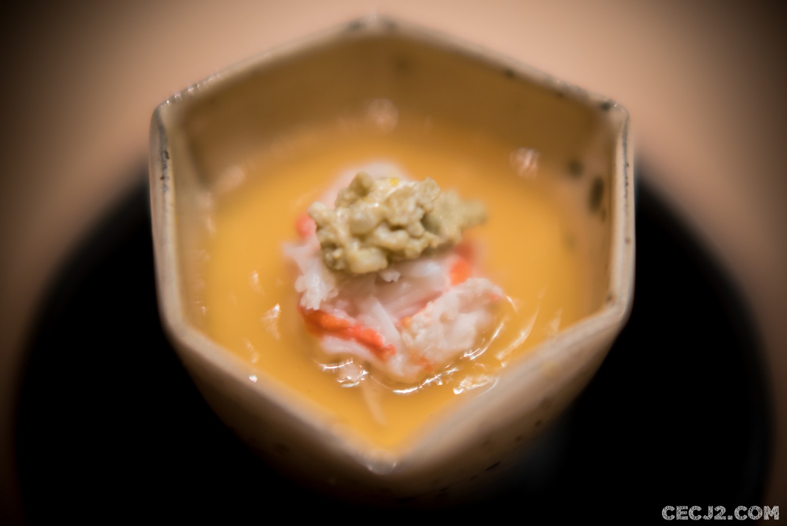 Sushi Shikon est mon premier « 3 étoiles » au Guide Michelin dans la catégorie sushi. Pourtant, il ne s’agit que d’un comptoir, d’un chef et de son équipe, qui sert du poisson cru. Qu’est-ce qui justifie une telle distinction ? C’est très simple : la fraîcheur des produits et leur origine. Nous avons beau être en Chine, tout, et je dis bien tout vient du Japon. Les poissons bien sur mais aussi le charbon Binchotan 備長炭 mais aussi plus étonnant, l’eau. On comprend vite ici que chaque détails comptent. Ensuite, le chef est issu d’une famille de Tokyo où il est le troisième maître sushi. Il nous a raconté qu’à 3 ans son père lui préparait déjà des morceaux de poisson cru. Et nous avons eu l’immense honneur que Yoshiharu Kakinuma nous prépare le repas ce soir là. Ce que j’ai vraiment apprécié, en plus de l’expérience hors de temps que représente un repas de sushi pour moi, c’est sa gentillesse et sa simplicité. Il a bien pris le temps de répondre à mes questions et nous a expliqué en détails notre repas. Ses gestes sont précis : il plonge la main droite dans la glace pour ne pas réchauffer le poisson et sa découpe est fluide. Sa connaissance du poisson est immense car il se permet de faisander des thons ou des maquereaux ibériques pour en révéler toutes les subtilités. En entrée, un crabe des glaces Kobako femelle avec ses œufs. Le goût fin est relevé par des saveurs marines discrètes. Nous avons eu le droit à un plat hors carte, du foie d’ormeau, du « foie gras » dans le texte (le chef aime bien la cuisine du Passage 53 à Paris). Un des plats phares du chef, c’est la pieuvre mariné : étonnante saveur, presque tendre, avec des accents de porc ibérique. Très bien maîtrisé. Pendant ce temps, sur le fameux charbon, nous avons eu un poisson légèrement grillé aux accents boisés et fondant. Là encore, tout est dans le geste, avec l’assistant qui râpe au dernier moment un zeste de Yuzu. Un plat qui m’a un peu déçu fut le Chawan-mushi que j’ai trouvé trop acide. Puis viennent les sushi, tous plus beaux et délicieux les uns que les autres : thon gras, oursin, anguille de mer, une omelette sucrée… Le riz est parfois blanc, parfois imprégné de vinaigre brun. Je retiendrai le calamar Ika finement ciselé aux saveurs de beurre, les deux types d’oursins Uni d’Hokkaïdo, l’un sucré, l’autre iodé, le thon rouge rutilant et fondant, et les immenses crevettes tigre. Enfin, en dessert, et comble du snobisme, des fraises Japonaises en plein mois de décembre. Sushi Shikon est effectivement un endroit unique où je ne regrette pas d’être allé même s’il a fallu batailler ferme pour prendre des photos, car normalement, on ne peut les prendre qu’avec un téléphone. Je doute que le lecteur assidu est apprécié ce genre de photos sur un restaurant de cette classe. Enfin, le prix est exorbitant et je vous conseille d’y aller à midi si vous êtes tentés car c’est presque deux fois moins cher. La décoration est simple avec un long comptoir en bois et un autel au Dieu des pêcheurs Yebisu au fond. Une expérience unique que je n’oublierai jamais.