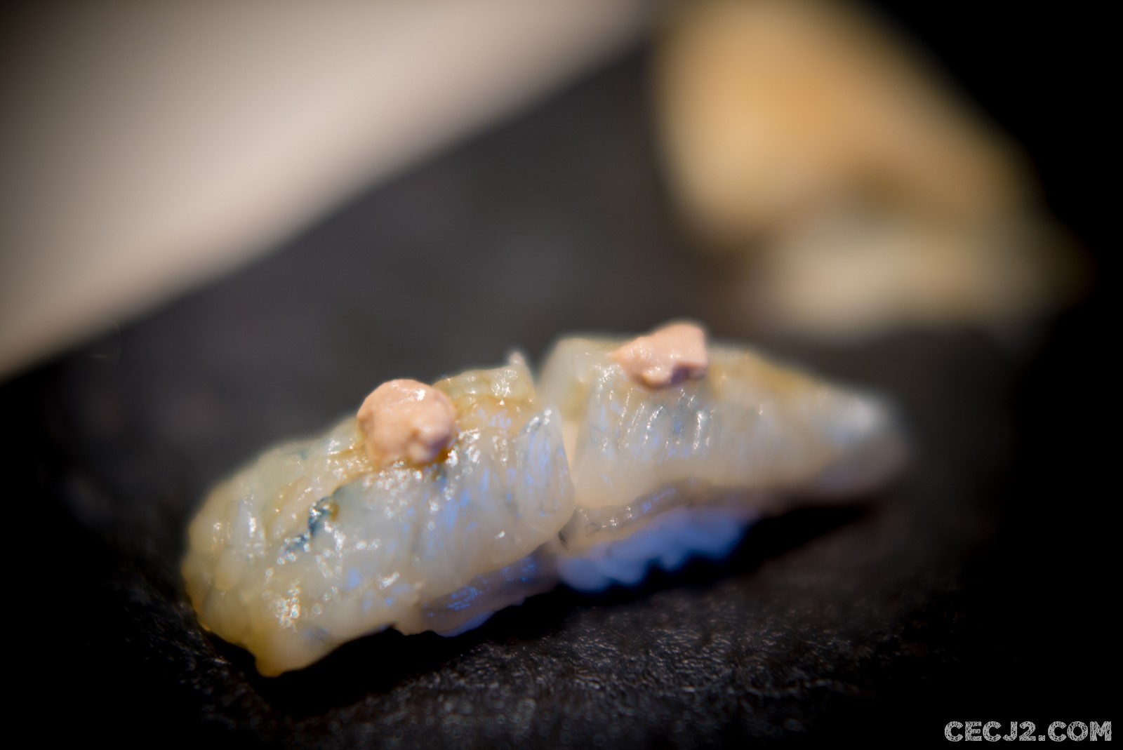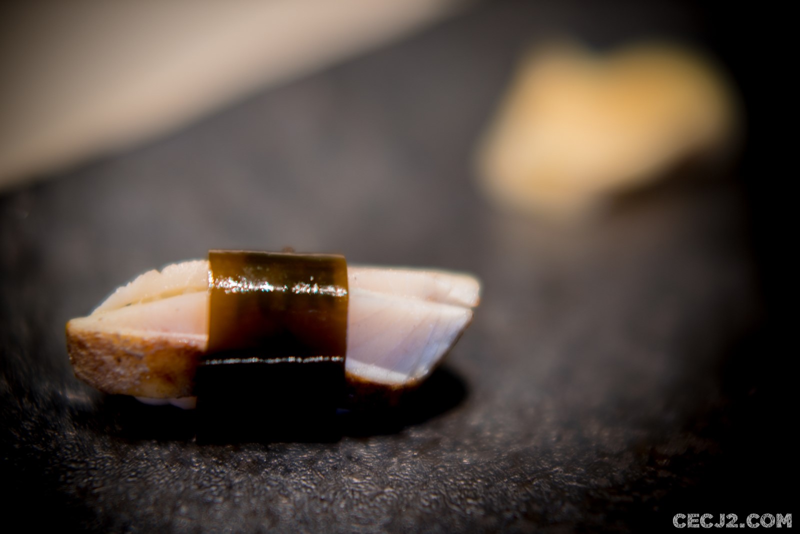 Sushi B est la dernière adresse en date de l’excellence Nippone à Paris. Ici, l’ancien chef de Bizan et ma serveuse préférée de Takara vous propose des sushi et des petits plats dans un cadre luxueux. Masayoshi Hanada est seul derrière le comptoir pour vous proposer de petites boulettes de riz recouverte de poisson cru, parfois très originales. Je retiendrai deux saveurs : acide et sucrée, que l’on retrouve de nombreuses fois lors du repas comme dans l’impressionnant maquereau au Shiro Ita Kombu, un peu à la façon du sushi Battera d’Osaka, pour la première, ou dans une sublime coquille Saint-Jacques pochée, pour la seconde. En entrée, nous avons eu le droit à un bento du Nouvel An dans une magnifique céramique en forme de boite : une crevette, des haricots rouges recouverts d’or ou bien encore une omelette Japonaise façon Castella, un gâteau Japonais d’inspiration Portugaise. Dans le « menu terre », il y avait aussi un consommé de homard avec de la truffe en fine tranche. Puis, un surprenant sashimi de bar avec du Yuzu pimenté, très salé mais intéressant. Ensuite, un poisson cuit, de la sériole, aux saveurs marines. Enfin, les sushi : au bar, au thon rouge, à la seiche (fondante comme du beurre), de la crevette crue recouverte de son corail, du thon gras O-Toro (d’un très beau rose), un thon rouge fermenté deux jours (pas très beau mais original), de la sériole, de la coquille Saint-Jacques recouverte de truffe et le fameux maquereau que j’ai évoqué précédemment. Encore un petit plat composé d’œufs de truite sur du riz avec du wasabi fraichement râpe. Mais ce n’est pas tout, le chef nous a surpris avec un Temaki au thon et aux poireaux, croquant à l’extérieur et fondant à l’intérieur. Pour finir, un Daikon fermenté avec de la moutarde, une soupe de miso rouge et de la seiche façon « hérisson ». En dessert, une glace à la patate douce avec un gelée au whisky, et du tofu au Kinako. Un repas mémorable qu’il faudra recommencer car le chef était limité au niveau des poissons après les fêtes de fin d’année.
