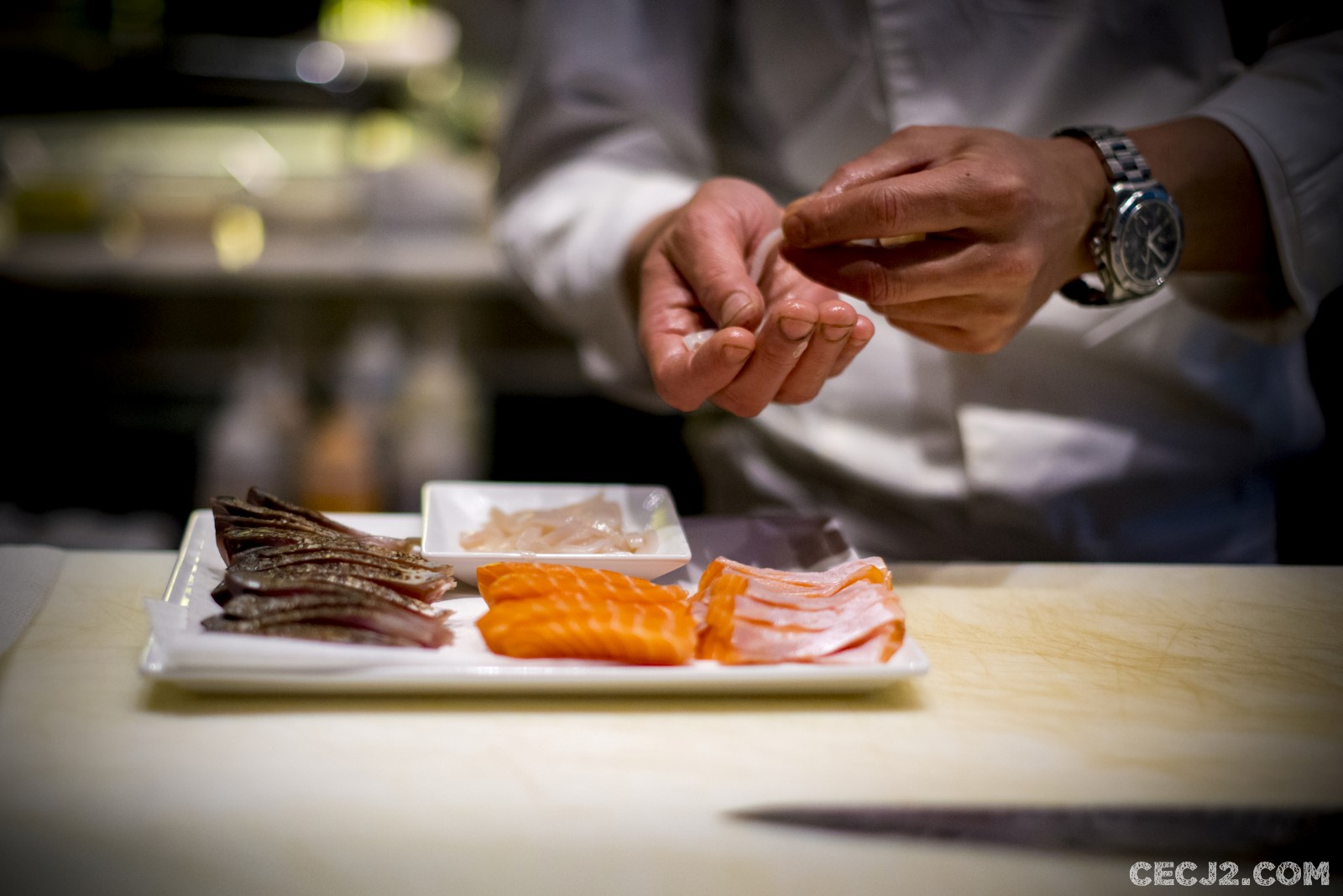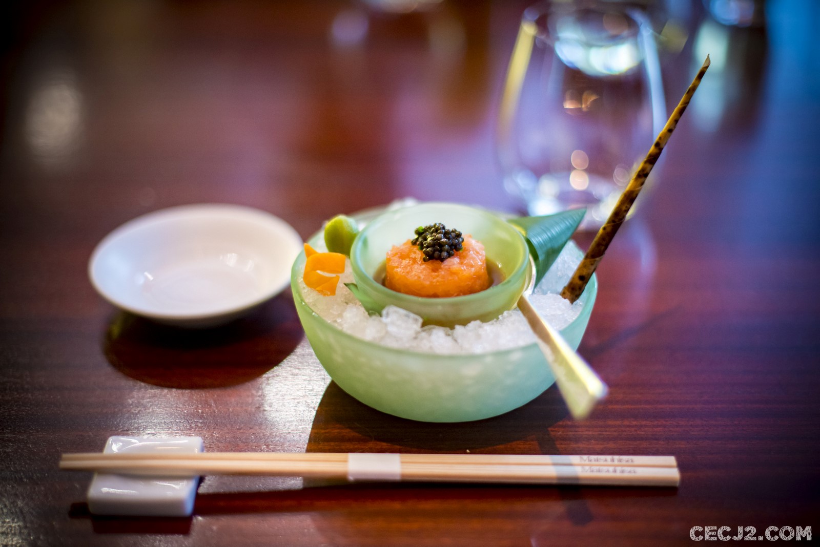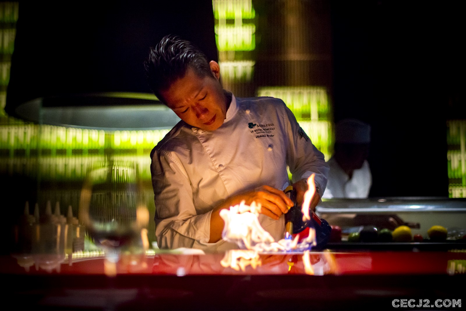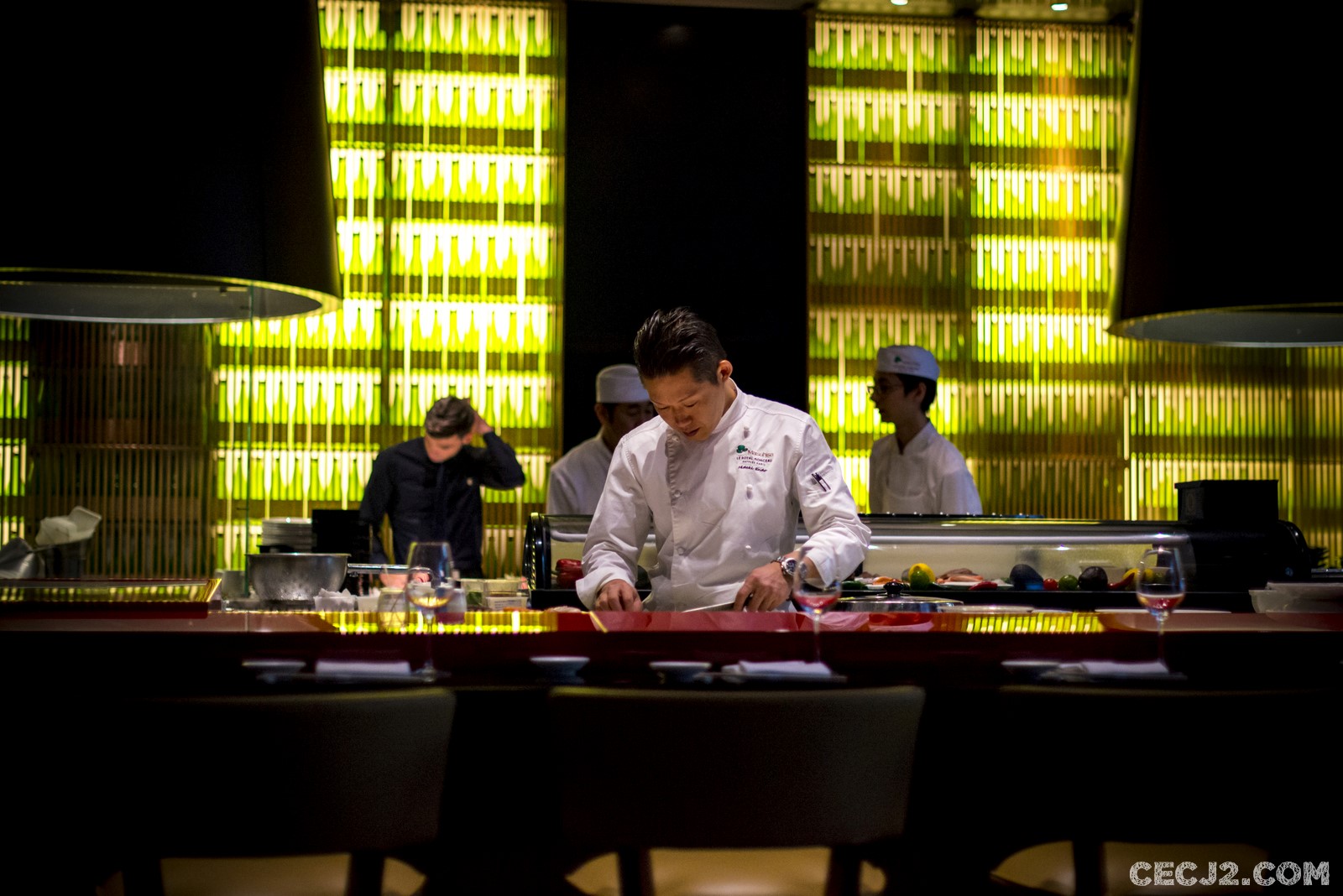 Le chef Hideki Endo est un orfèvre. Originaire d’Hokkaïdo, ayant fait ses armes à Hong Kong, il débarque à Paris pour ciseler le poisson tout en y apportant sa touche personnelle. Élève de Nobu, dont le restaurant du Royal Monceau tire son nom, Hideki revisite les classiques de la Gastronomie Nippone avec des influences du Pérou avec des produits locaux. Sa spécialité : le Sashimi « new style » qui permet à celles et ceux qui ont peur de manger du poisson cru de commencer l’expérience. En effet, le poisson, ici du saumon, est préparé avec de la ciboulette, des grains de sésame et du gingembre, mais surtout le poisson est saisi par de l’huile d’olive chaude. Je l’admets, j’étais un peu inquiet avant de gouter, m’imaginant un plat très gras. Mais en réalité, pas du tout, cela rend le poisson encore plus fondant et c’est juste très très bon. Ce plat est vraiment unique et vaut vraiment le déplacement. Le reste du menu dégustation propose 7 plats : un tartare de saumon avec du caviar royal et une Momoko (une petite pêche Nipponne au gout d’abricot), de la sériole en Sashimi avec du piment Jalapeño (craquant, acide mais pas trop fort), des Sushi de bonite, poulpe avec un California roll et des œufs de saumon sur du riz, un Tataki de thon super fondant avec du Karashi (moutarde Japonaise), un Black Cod mariné trois jours dans du Miso avec sauce un peu acide au Yuzu, du bœuf Black Angus en Anticucho (une préparation en brochette des Andes) et sauce très pimenté rouge et jaune, et un dessert à base de vanille, café et whisky. Tout est vraiment succulent mais ce qui m’a le plus marqué par rapport à la cuisine Japonaise c’est l’utilisation du piment, de l’acide et surtout la quasi disparition du riz. Tout cela est bien compréhensible quand on sait que le chef Nobu a quitté son île natale pour exercer en Amérique du Sud où il a du composer avec les produits locaux, ce qui lui a permis de construire le succès que l’on connait, avec des restaurants partout dans le monde et un partenariat avec Robert de Niro. Malgré une ambiance un peu trop bruyante pour moi, le service attentionné sans être obséquieux et surtout, la simplicité et la gentillesse d’Hideki, m’ont fait passer un moment exceptionnel que je vous recommande.