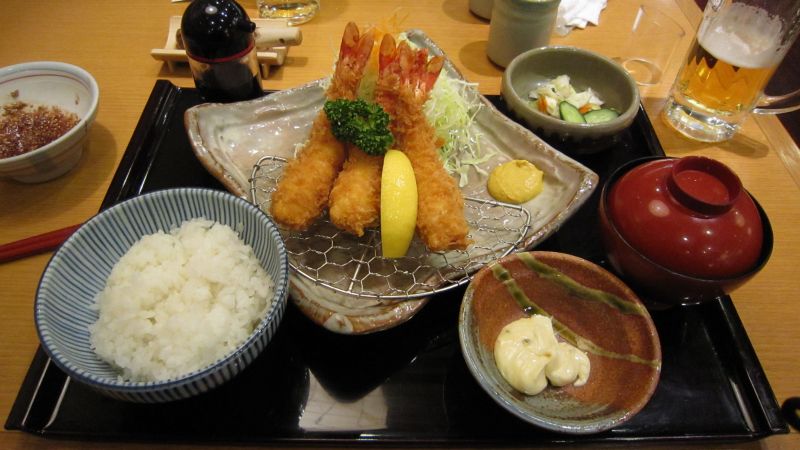 Voici un restaurant où l’on déguste des tempura de crevettes : ambiance décontractée et machine à thé (au Japon, on vous serre plus souvent du thé qu’une carafe d’eau). Les crevettes étaient accompagnées de mayonnaise, d’une soupe miso, de légumes salés et d’un bol de riz. Il y avait aussi des crevettes au curry (Karēraisu).