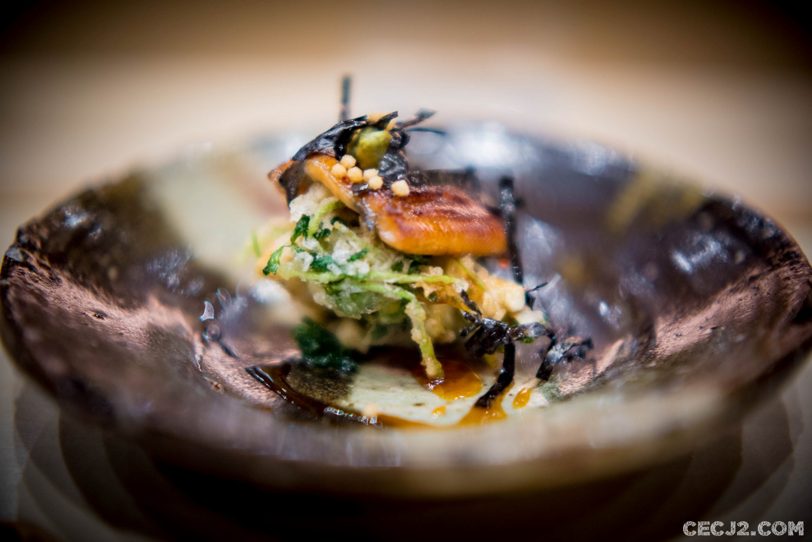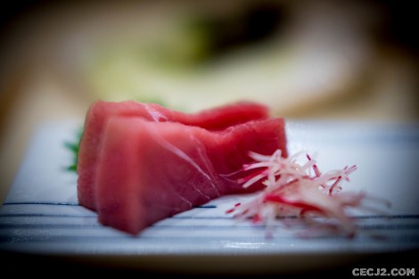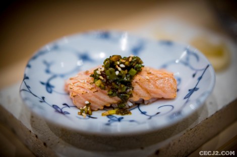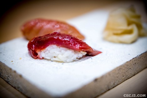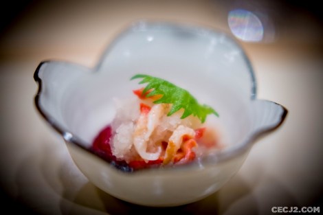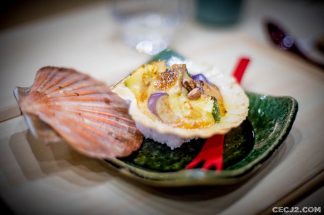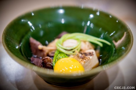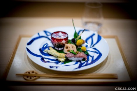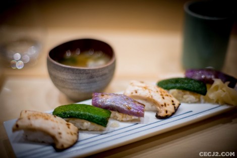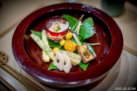 Le Chef Ryuma Tabuko est le fils d’un artiste, Kyoji, qui a rénové la chapelle Saint-Vigor en Normandie, et qui a travaillé pendant une vingtaine d’année à Fukuoka dans un restaurant étoilé, dans le Sud du Japon. Et c’est avec l’ancien chef de Comme des Poissons, Yoichi Kino, qu’il nous propose le soir trois menus d’exception dans son nouvel écrin Parisien : un menu Sushi, un menu Kaiseki et un menu Shojin Ryori. Komatsubaki est installé à la place du feu Hyotan qui servait un sashimi de cheval et d’excellentes limandes grillées. J’ai choisi le Kaiseki, le menu impériale de Kyoto, car il me paraissait être la plus belle expression du chef Ryuma. Le repas commence avec de la langoustine, du barbue grillée, de l’asperge sauvage et une gelée au Yuzu, le fameux agrume Nippon. Puis une soupe d’asperges avec du crabe. Ensuite un trio de sashimi : thon gras, bar, liche. Tout est servi dans une délicate porcelaine réalisée par le père artiste du chef. Le plat suivant fut le summum du repas avec un Tempura de maïs, du vernis mariné, un bar au miso, et surtout un Sushi de bœuf de Kobe avec du Yuzukosho, une brochette Kushiage armoise et fécule de riz, et d’étranges graines de Ginkgo. Le gratin de Coquille saint Jacques avec courgette et aubergine était aussi très fin et délicat. Enfin, un Sukiyaki de bœuf de Kobe, une espèce de fondue avec un œuf venait terminé avec les produits de la terre. Mais il ne fallait pas oublié me Kakiage de légumes, une espèce de Tempura d’Osaka, avec son anguille grillée sauce Kabayaki. Le plat le plus étonnant étant un Sunomono, une préparation marinée, de vernis et de… fraises ! Vous pensiez en avoir terminé mais il restait un plat à base de riz et de saumon mi-cuit, très bon, avec ses œufs de saumon. Dans le menu végétarien, il y avait même des Sushi aux légumes. Pour conclure ce repas gargantuesque, une petite glace au sésame noir avec des fruits frais et une feuille d’or. Malgré la récente ouverture, les plats s’enchaînent sans faux pas et j’ai ressenti tout la dextérité du chef. Allez-y vite avant que l’adresse n’obtiennent sa première étoile au Guide Michelin !