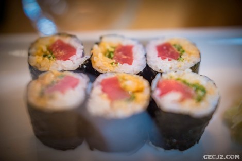 Le sushi moriawase du midi est constitué de 6 negitoromaki, 2 thon, 1 saumon, 1 crevette et 1 poisson blanc. Les tranches de poisson sont bien épaisses. Mais finalement, les sushi (et les maki) sont trop gros, on a la bouche pleine quand on les enfourne. Le riz m’a semblé à la fois pâteux et ne tenant pas bien. Et j’ai trouvé l’ensemble fade, peut-être parce qu’il n’y avait pas de wasabi sous le poisson.