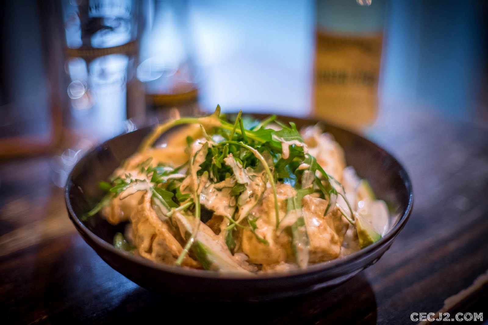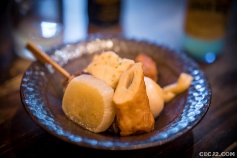 Ganso Tensai Bakabon est une série de 1975 racontant le quotidien d’un ancien scientifique de génie aujourd’hui devenu sénile. Il habite avec sa famille, qui prend soin de lui mais doit gérer tous les tracas qu’il engendre. Et il faut dire que cette nouvelle Izakaya, une espèce de bar à tapas Nippon, porte bien son nom car le chef est complétement déjanté le jour où je suis venu. Il s’active dans tous les sens et crie en permanence sur les pauvres serveuses débordées. Au menu, des plats typiques comme de l’Oden, le pot-au-feu Japonais, des Agegyoza, des raviolis frits au canard (très original) ou bien encore, une espèce de haddock salé et fumé, puis grillé, un Hokké (Terpuga arabesque de Okhotsk), une spécialité du Hokkaido. Mais il y a aussi des plats fusions comme ce Ceviche de sériole (Hamachi), un Bao-Burger ou un très Espagnol Pimientos de Padrón. Pas mal mais je regrette le déplacement à l’autre côté de Paris.