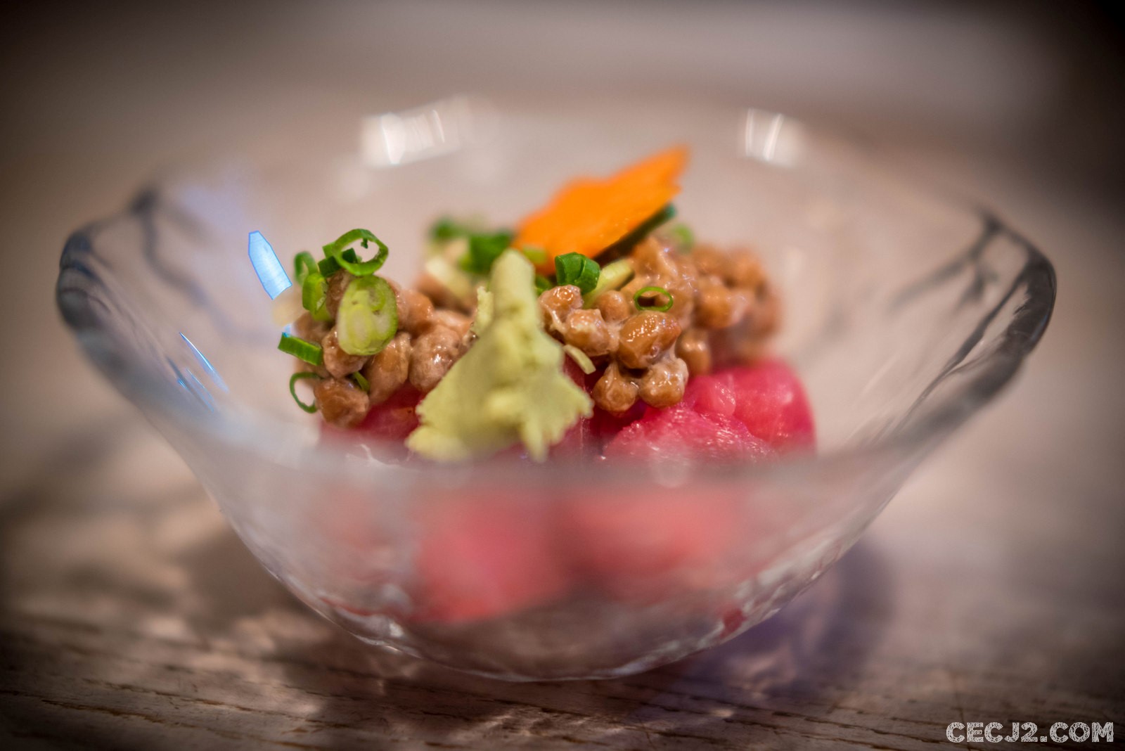 Kanadé signifie littéralement la « confection de la mélodie » mais dans cette nouvelle adresse crée par l’ancienne équipe de Ten, il faut plus y avoir l’harmonie entre la cuisine et le service. Car, comme dans la musique, si la partition et les interprètes ne sont pas synchrones, le concert sera raté. Et c’est un sans faute auquel vous aurez droit : un grand choix de poisson pour les Sushi, de très originaux Maki à la peau de saumon et surtout un délicieux Onsen Tamago Onigiri, une boulette de riz avec en son centre, un œuf mollet. Un très grande réussite. J’ai pris aussi les Tempura de crevettes, très bons, et un original Thon au Natto, le soja fermenté gluant. Mais la carte ne s’arrête pas là avec des Soba, les nouilles de sarrasin, un Chickenkatsu, un poulet pané à la sauce sucrée Teriyaki, ou un Shake Avocado Don, un bol de riz recouvert de saumon et d’avocat. La décoration faite de béton industrielle datant de Sara, et son long comptoir sont du plus belle effet.