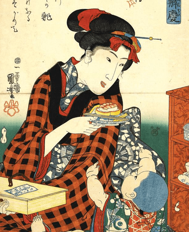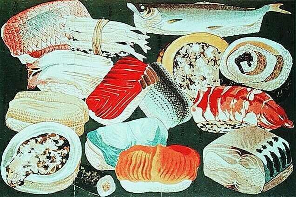 Enfin, c’est à Edo (l’ancien nom de Tokyo), que le sushi moderne, le Nigiri-zushi a été crée dans un bar par Yohei Hanaya (1799–1858). Le riz est moulé à la main et le poisson est posé dessus. Cette création dérive du Haya-zushi (sushi « rapide ») qui était beaucoup plus gros que maintenant car il était comme un grand sandwich que les gens achetaient pour déjeuner. Mais la création d’Hanaya était légèrement cuite ou mariné dans de la sauce soja ou du vinaigre. D’ailleurs le vinaigre n’était pas blanc mais rouge car issu de la lie du saké, lui donnant une autre saveur. C’est lui qui a pensé a ajouter une pointe de wasabi dans ses créations. Vous trouverez un lien avec le plan d’un de ses restaurants en bas de page. Voici une représentation de ses créations en 1877 :