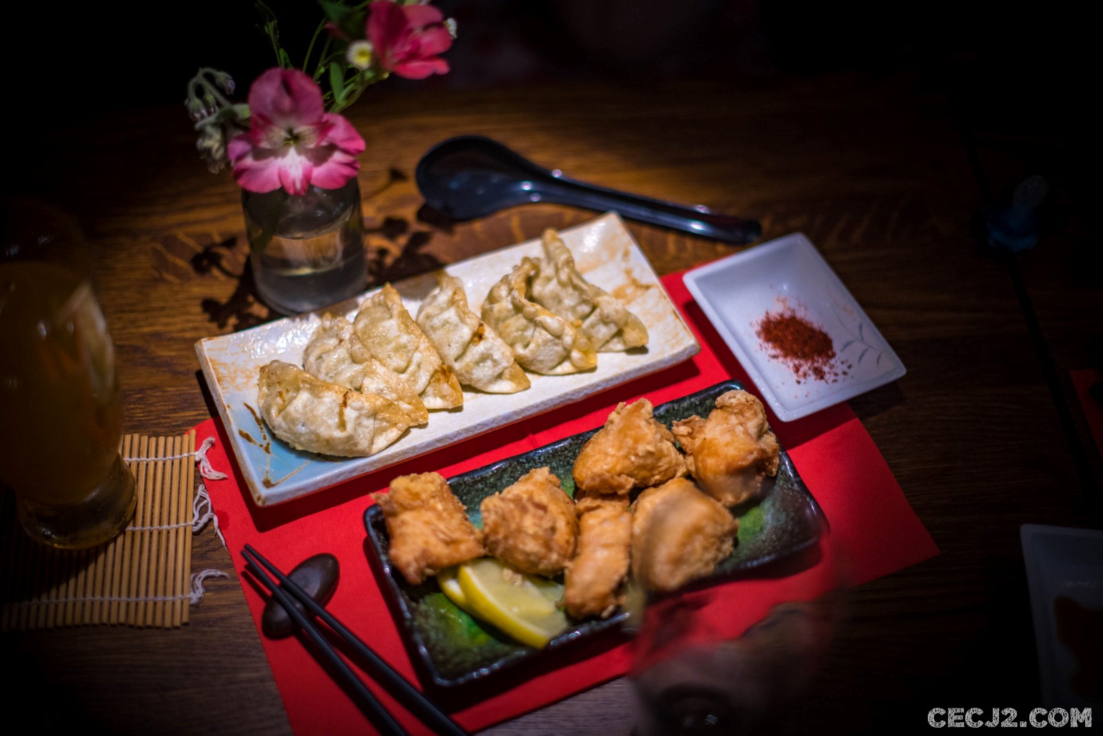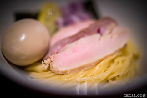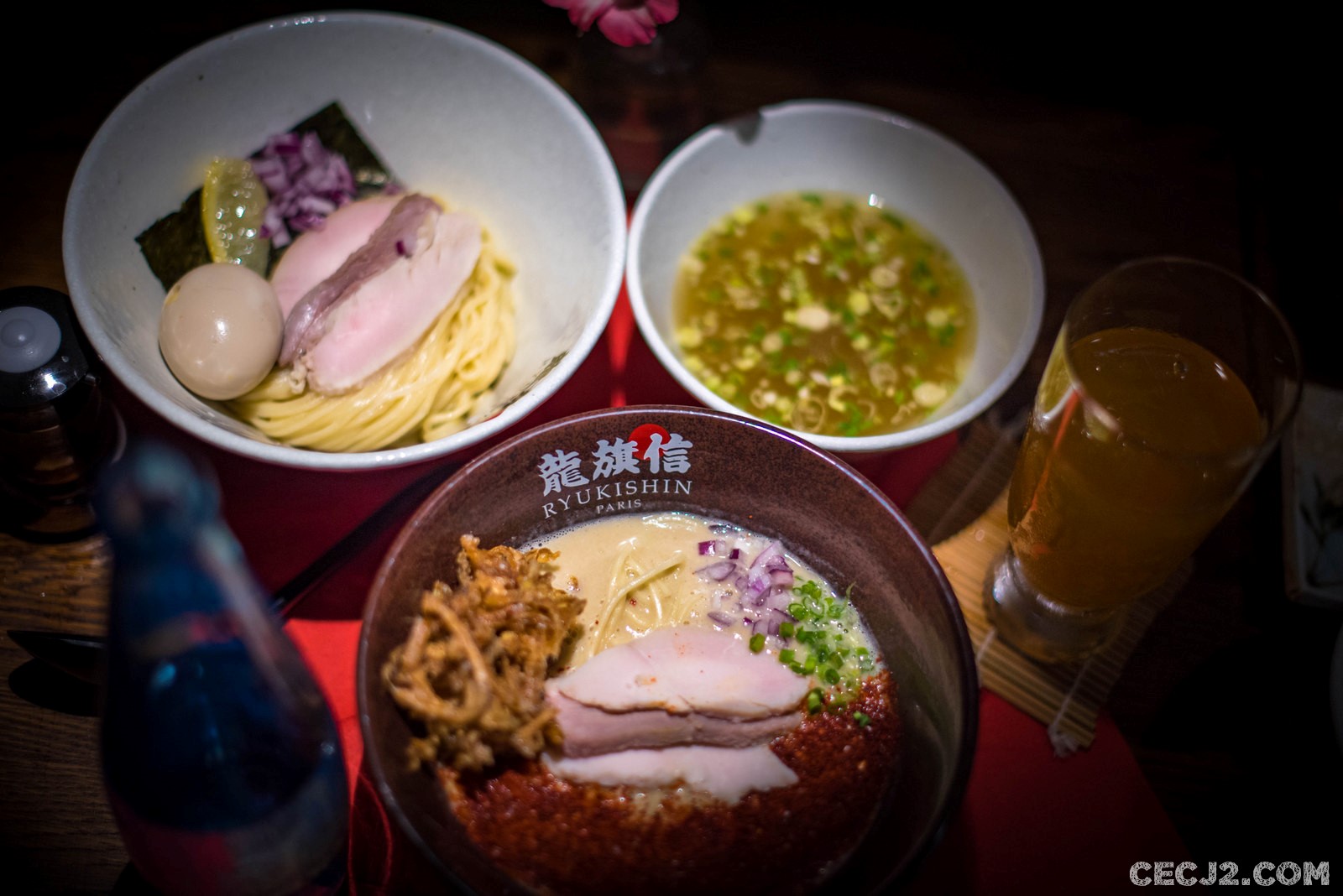 Kazuo Yamagishi a inventé en 1961 à Tokyo les Tsukemen つけ麺. Littéralement, cela signifie les « nouilles trempées » car les Ramen dans notre cas (les Udon ou les Soba, comme chez Sobayoshi à Osaka) sont trempées dans un bouillon servi à part. La soupe possède un goût bien plus intense, salé, riche en Dashi. C’est très original et certainement un des seuls restaurants en France qui sert un tel plat. J’en avais mangé quand le célèbre restaurant d’Hollywood, Ikemen (qui a aussi fermé), avait débarqué en 2014 pour la Ramen Week. Le gérant avec ses beaux cheveux blancs et son Panama, vous accueille au sein du restaurant avec une ambiance tamisée. On reconnait l’espèce d’aquarium central du feu Tofuya où sont installés les cuisines. On se sent tout de suite à l’aise avec les petits bouquets sur les tables et les spots qui éclairent vos plats. J’ai aussi gouté les Karaagé, un peu secs, et de très surprenants Gyoza au poulet et légumes, certainement le meilleur de tout ce qu’on a mangé. Enfin, je voulais absolument les Ramen Païtan épicé 辛白湯, qui m’ont un peu surpris et déçu à la fois. Peut-être que j’en attendais beaucoup mais cela m’a fait penser à des nouilles dans une blanquette de veau (même si le bouillon est au poulet et qu’il y a du canard braisé). Le fond très crémeux n’allait vraiment pas avec le reste du plat Japonais selon moi. Je suis peut-être trop classique mais gustativement parlant, j’ai été choqué. En exagérant, c’est du niveau de la fameuse « morue aux fraises » de Gaston Lagaffe. Par contre, le Tempura de légumes, le Kakiagé, était délicieux. Alors que penser de Ryukishin ? Difficile de donner un avis tranché sur un restaurant qui vient d’ouvrir. Globalement c’est bon mais je m’attendais à mieux. Par contre si vous ne mangez pas de porc ou si vous êtes végétariens (bouillons à base de légumes, Kombu et Shiitakés), c’est l’adresse Nippone idéale de l’année.