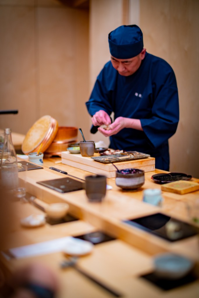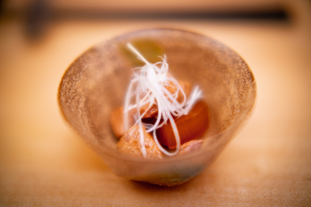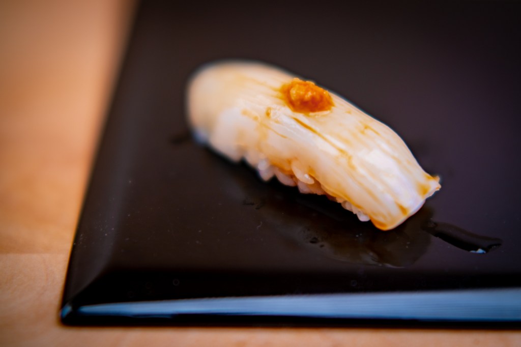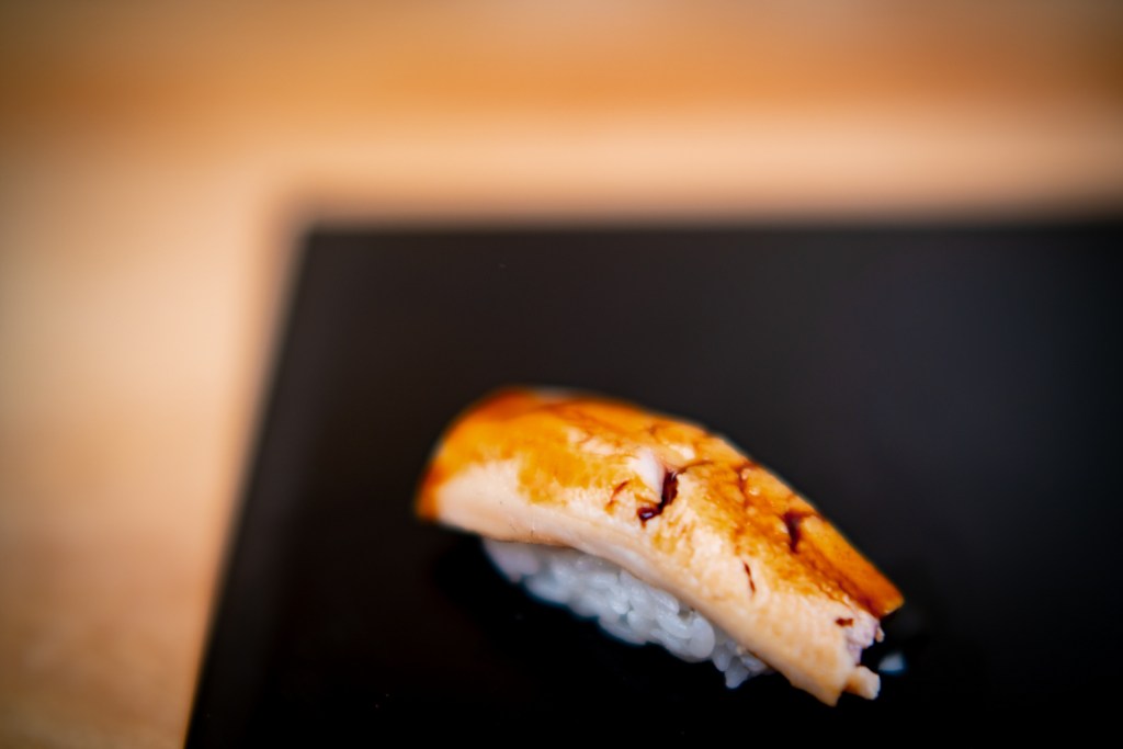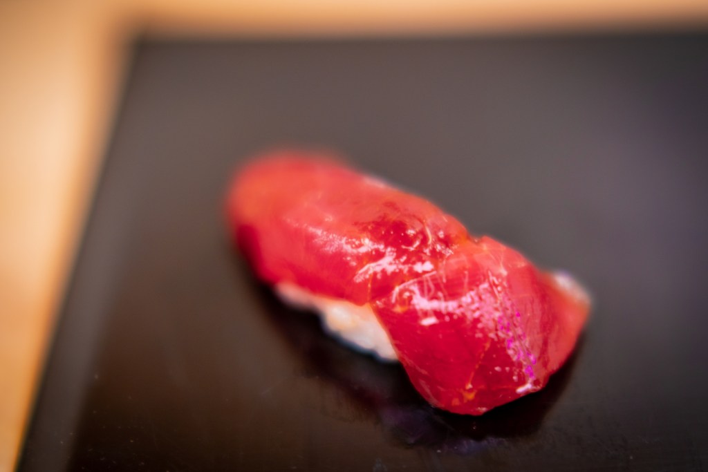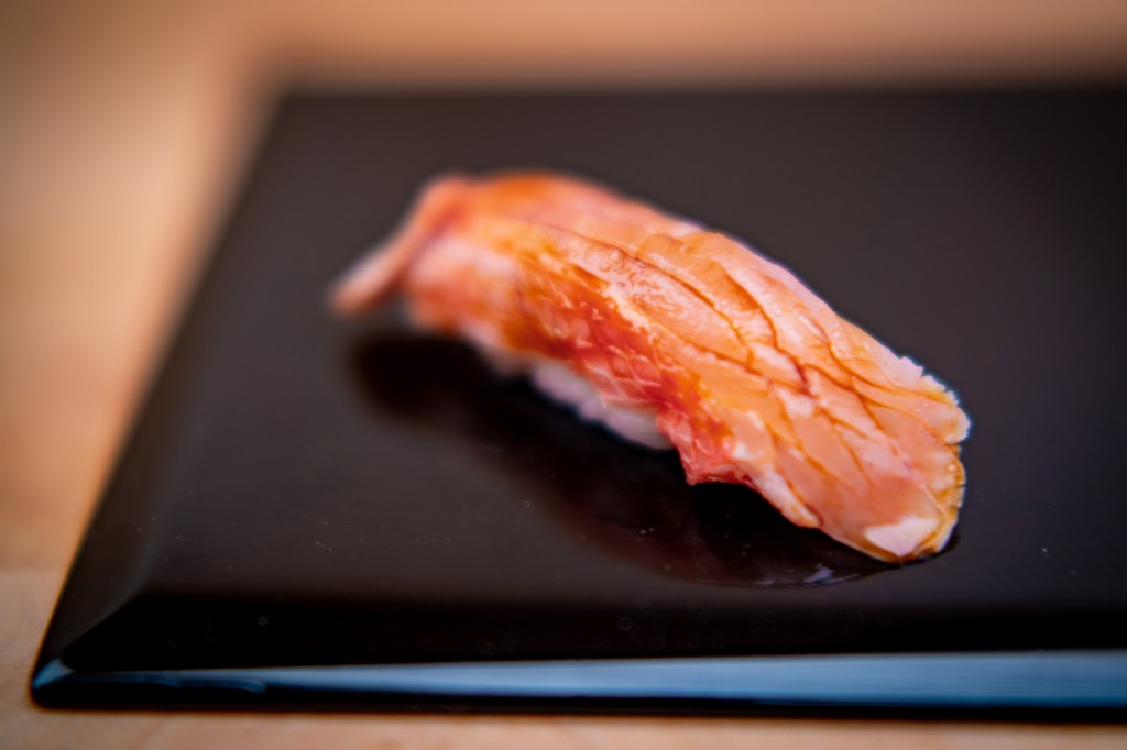 Il est rare que je retourne deux fois dans un même restaurant, d’autant plus quand il est cher et que je n’avais pas aimé… Mais la présence du chef Morooka Takeshi que j’avais connu chez Sushi Ginza Onodera Paris il y a quelques années a suffi à me convaincre immédiatement ! Bien que le chef chercher encore ses marques dans ce restaurant au rythme effréné (deux services en une soirée, c’est presque de l’exploitation). Je ne me souviendrais que d’un sushi et pas des moindre, celui de Kinmedai 金目鯛 (Béryx) : une sorte de poisson rouge originaire de la baie de Tokyo, délicieux, ferme et fondant à la fois. Cette fois, je recommande Sushi Shunei.
