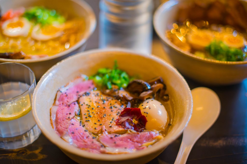 Gaijin Ramen, comme son nom l’indique, n’est pas fait pas un Japonais, mais par un « étranger ». Malgré tout, je trouve que cette nouvelle adresse à sa place sur mon blog. J’avais remarqué cette enseigne sur le web qui proposait des ramen en kit à faire chez vous et ils ont enfin ouverts leur adresse. Mon avis ne reflète que les deux premières semaines de leur existence et je ne doute pas que des défauts de jeunesse seront corrigés plus tard. Par exemple, j’ai trouvé que le bouillon n’était pas assez chaud ou qu’il ait fallu demander plusieurs fois une carafe d’eau. Par contre, on sent la recherche sur le bouillon justement, qui, même s’il n’est pas parfaitement Japonais, est très onctueux. Le Chasu lui était absolument parfait, gras à souhait et rit comme il faut. J’ai gouté le Ramen spécial foie gras canard avec un bouillon canard agrumes, une réussite, le Tori Spécial à base de poulet à l’ail noir et le Shio Païtan toujours à base de poulet mais plus épais. La décoration est sympathique avec une arche rouge pour vous mettre dans l’ambiance. Au final, je pense que c’est une adresse pleine de potentiel qui ne peut que progresser !