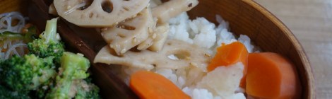 Repas maison contenu dans une boite laquée avec en général du riz, de la viande ou du poisson, et des légumes salés – 弁当